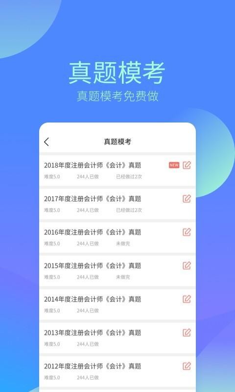 3、点击真题模考,查看各个年份的真题信息,快速选择不同年份真题进行练习