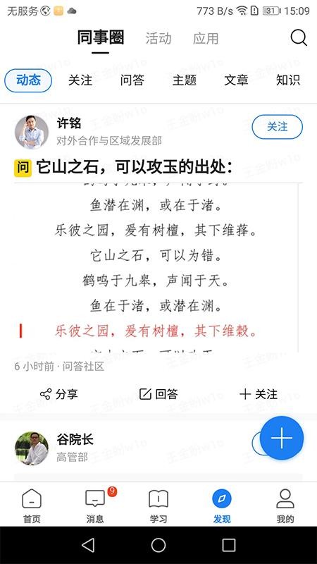 5、打开发现版块,查看同事圈中的各种动态信息,和其他用户在线交流互动