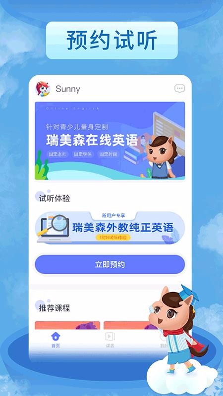 瑞美森教育是一款家装辅助小孩学习的软件,里面为家长提供了课程选择和预约功能,为小孩提供丰富的学习课程资源,还在课程后面提供家长评论专区;平台上推送展示了纯正的外教英语课程,家长朋友能可以快速预约里面的课程并获得和外教上课的机会,预约后就能在课程中心的待上课栏中看到所有等待上课的列表资源;这里面为小孩汇集了丰富的学习资料,里面有绘本阅读类、故事类等不同的资料内容,不上课的时候能从这些学习资料中挑选喜欢的资料打开学习;所有的外教课程上课之前都能提前进入到预习环节中预习课程讲解的内容。