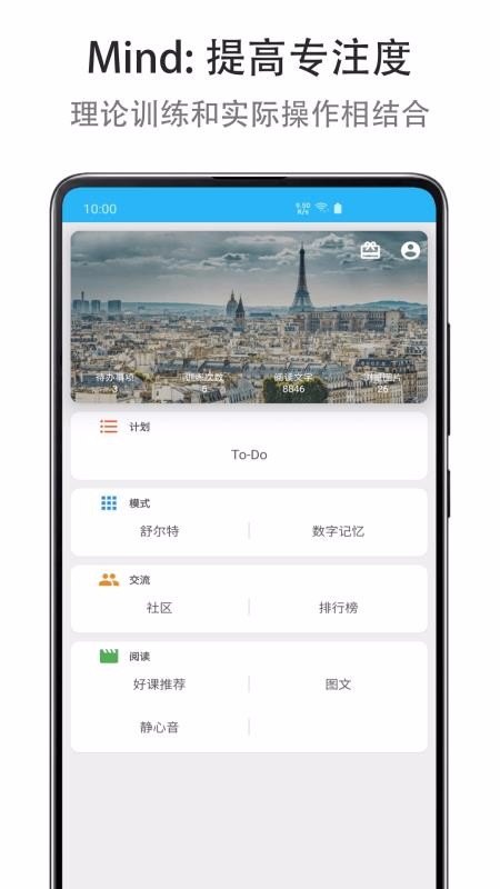 Mind 提高专注度app是一款练习专注力的软件,让你学习各种专注力训练的方法,提高专注力练习的效率;让剑提供了多种专注力练习方法,通过训练提高专注力,提高工作和学习的效果,让你事半功倍;计划每天的目标,便于专注于目标,轻松完成目标,专注力大大提高;通过舒尔特训练快速提高对事物的专注力,了解每次训练的结果,知道专注力的变化情况;每天都会更新图文资讯,让你阅读文章,了解文字的内容,让你知道坚持的重要性,让你的训练更有动力;可以为你提供降噪音服务,让工作和学习能更专注,不受外界影响,也能更放松的睡觉。