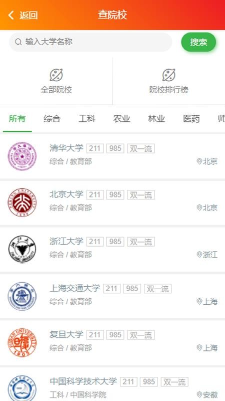 5、在这里,将各种院校进行了详细的分类,分为工科、农业、林业和医药等,方便用户查看;