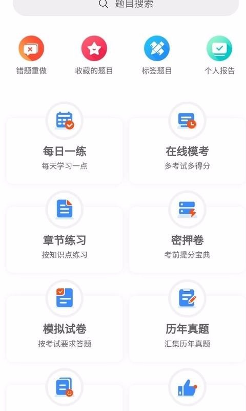 4、划分不同的题库练习模式,同时在题库中划分了模拟试卷、历年真题、章节练习以及每日一练等模块;