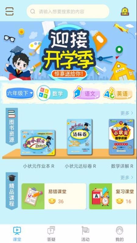 状元共享课堂app是一款专业的学习平台;这里是为中小学生提供的实用学习软件,学生可以使用这款软件轻松的学习,能够有效的提升自己的学习成绩;这里有人工答疑的功能,不会的知识点有智能人工答疑,能够帮助学生及时获取知识;实时推送众多的学习活动,可以选择查看活动详细,及时参与活动;提供数学、语文和英语知识,可以自由的选择学习,学习更全面;提供图书资源,支持学生选择图书查看众多的知识,能够及时有效的补充知识点,帮助学生积累更多的知识;使用这款软件学习,随时随地打开就能学习,学习时间自主安排。