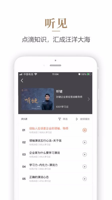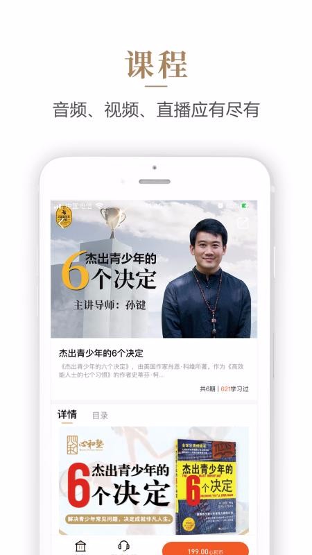 1、提供多种不同的课程内容资源,除了视频课程外还提供了听书音频类的课程;