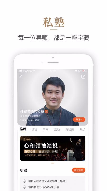 2、划分丰富的私塾老师内容页面,里面展示了该老师的推荐栏、课程栏以及短视频和观点等栏;