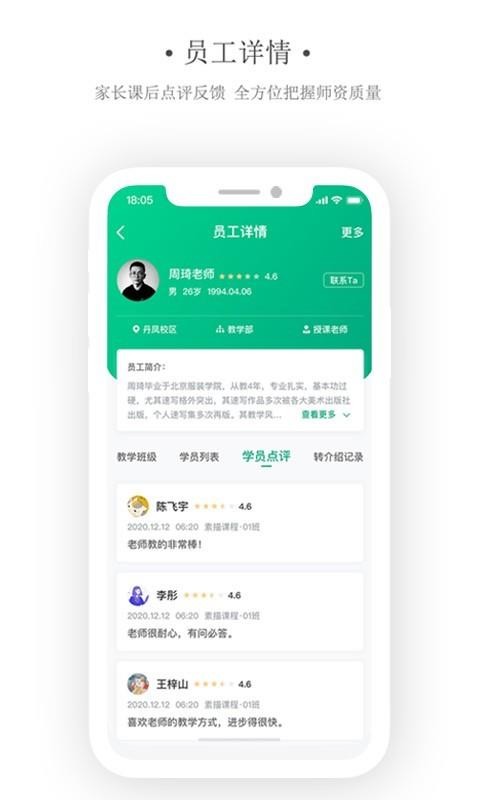 4、应用中有员工详情版块,在这里用户能够看到各员工详细信息和学员的点评内容;