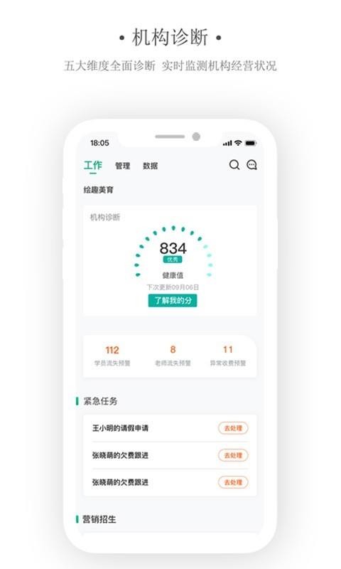 艺同学机构版app是一款为艺培行业提供服务的软件,让用户能够轻松管理自己的艺培机构,为学员提供更好的教育服务;应用中有多种功能,用户可以在这里清晰看到机构的详细经营状况,了解机构的收入信息,掌握机构目标达成情况;用户通过软件可以对机构的各种信息进行在线管理,了解各员工的出勤情况,掌握各学员的学习状态;在这里,用户还能够看到自己的各种任务信息,及时完成工作内容,快速对机构进行推广营销,获得更多的学员,提高机构收益;快下载这款软件试试吧,方便快捷的对机构进行管理,掌握机构经营动态。