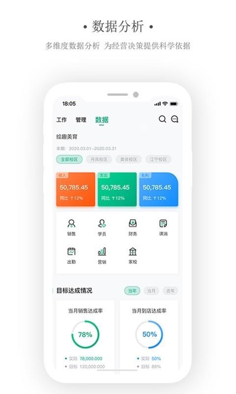 2、查看数据版块中机构的收支和利润信息,了解目标达成情况
