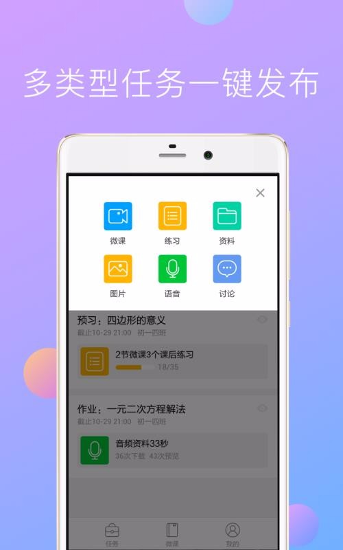 爱学堂教师app是专为教师提供的教学办公软件;教师可以使用这款软件随时在线发布作业,可以及时管理学生学习;这里有众多的微课,教师可以根据自己的需求直接选择相应的微课,可以及时下载课程,学习之后可以有效的教学;推送班级报告,教师可以通过报告直接查看到学生的作业提交情况,方便教师及时督促还未提交作业的学生;发布通知更加便捷,教师可以布置多种类型的试题,能够全方位管理学生作业情况;教师使用这款软件,可以更轻松的教学,能够帮助教师及时有效的完成教学任务,提高办公效率。