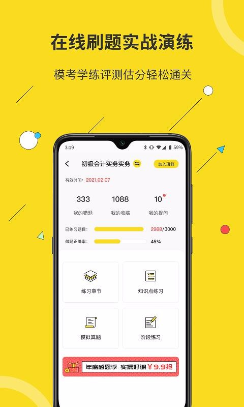 3、在线即可刷题和实战演练,通过模拟考试评估分数,让你轻松通关;
