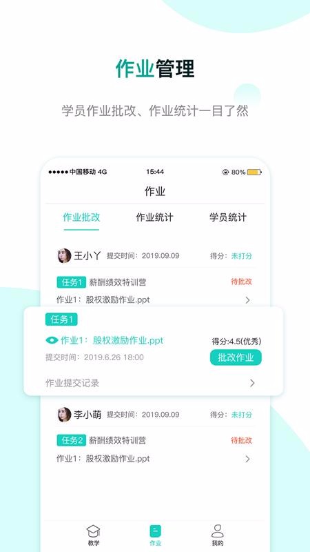 5、拥有多种不同类别的作业栏目,里面设置了作业批改、作业统计以及学员统计栏;