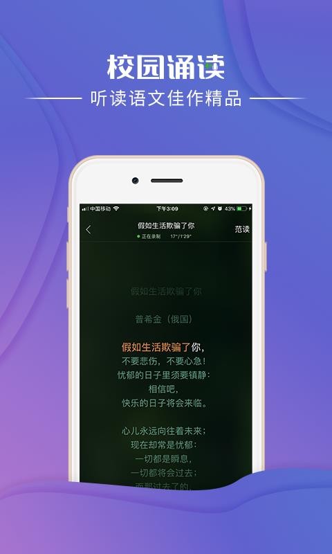 校园诵读是一款可以朗读课文的软件,帮助学生更好的进行学习,让学生在平台里快速的使用,提升学生的朗读能力,获得优质的学习服务;这款软件的功能非常的多,学生在使用的过程中,可以根据自己的情况快速的进行使用,实时的满足你的学习需求,让你可以随时随地的进行使用,非常的方便;平台提供的朗读资源非常的多,用户在使用的过程中,可以根据自己的情况快速的进行选择,找到合适你的学习内容,让你可以快速的提升你的学习能力;而且经过标准的朗读练习,让学生能够更好的进行发音,使学生养成良好的学习习惯,得到优质的学习服务。