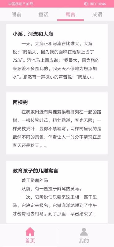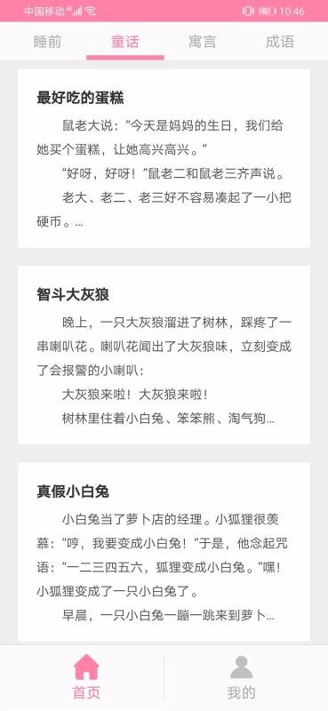 宝宝睡前故事是一个故事资源大全,里面拥有最简单的页面设计,还有最丰富的故事资源 ;应用中只设计了首页和个人管理中心,可以在首页中查找并筛选故事资源,在个人中心查看自己阅读的故事历史或修改设置个人资料等;首页中的故事资源按照不同的类型进行了划分,可以从中找到关于睡前以及童话类故事资源,每一种栏目下都有相对应的故事内容,这些内容卡片标签上显示了故事的标题,故事内容的摘要;所有的故事栏目在打开后都能对其中的故事一目了然,不需要打开故事详情就能从标题或摘要中了解关于该故事的大概讲解内容。