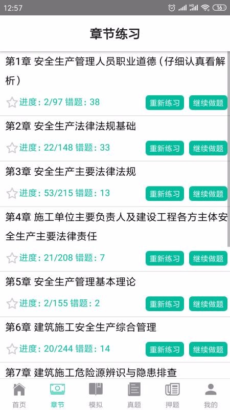 2、点击章节练习,直接选择第一章节进行逐步的练习,查看练习进度