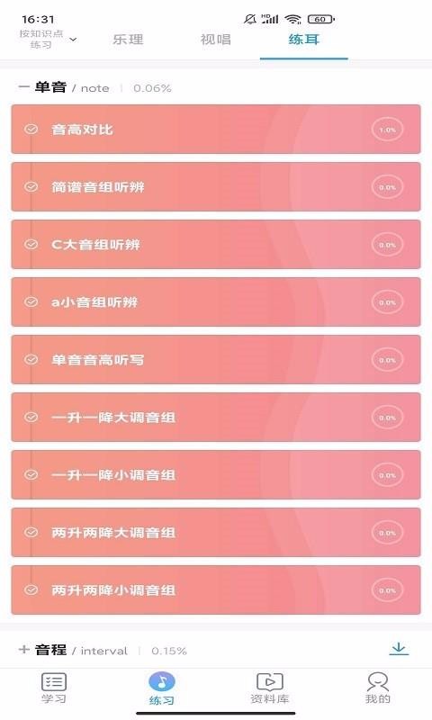 1、划分了不同的知识点练习栏目,练习中心拥有乐理、视唱以及练耳三种不同的知识点练习栏目;