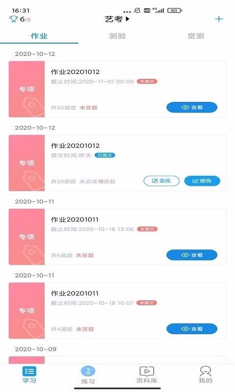 3、提供不同的学习类别栏,按照作业、测验以及堂测三种不同练习方式划分了三栏;