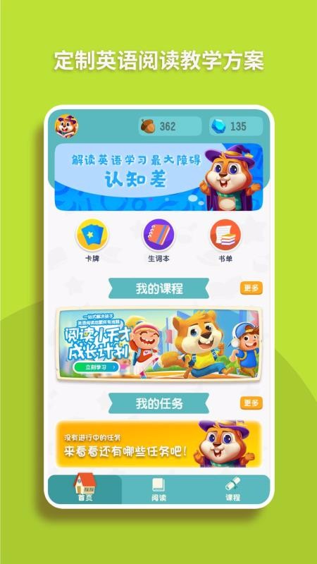 1、提供了阅读卡牌和活动卡牌,通过各种游戏化的场景来进行学习;