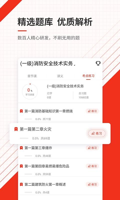消防工程师准题库app是专为广大消防工程师考试的用户提供的一款手机题库软件,这里能够为用户提供海量的题库资源,收录了大量的历年真题,支持在线模拟试题练习、在线视频学习、错题试题分析、考前押题攻略等内容,让你可以得到更好的学习效果;这里还有模拟题题库、每日一练、考点章节练习等,考生可以在不断答题过程中提高自己,也可以在这里观看各种直播课程,可以随时与老师互动学习,提出各种问题,能够及时的为您解答,帮助你掌握各种知识的难点和重点,高效提高自己的学习效率。