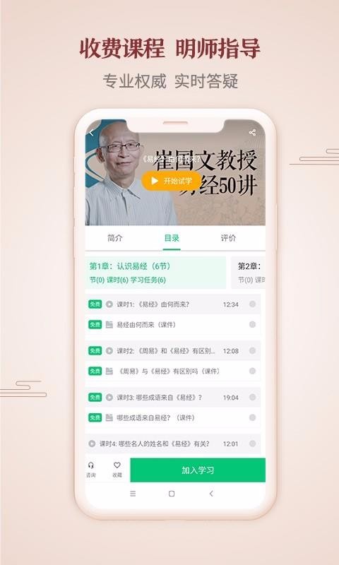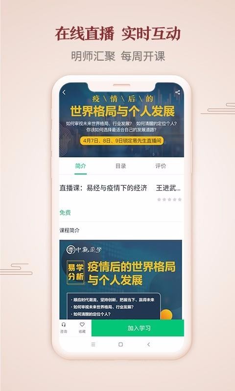 2、免费直播:国内外易学明师在线直播,教授用户如何系统学习并将理论学以致用。用户可与老师在线互动,老师免费答疑。