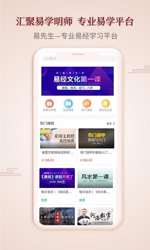 易先生app是一款专业的易经学习软件,这里包含了海量的易经知识和传统国学知识,立足于专业性的内容要求,同时与多位知名易学专家和讲师建立了合作关系,为广大用户提供了丰富的易学内容,覆盖的知识面广泛,包含有风水、八字、奇门、国学和易经等多门学科,采用线上和线下的组合式学习,可以为易经爱好者提供专业化、系统化的学习模式;平台提供的专业课程分为免费公开课程和收费精品课程,付费课程会有更加深入的知识讲解,您可以根据的需要进行听课学习。