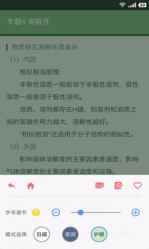 米缸高中化学是针对化学科目设置的学习软件,可以在该应用中阅读化学知识点、练习同步配套习题或编辑笔记等;应用中提供了同步化学教材的课程章节,能在章节中看到与自己课本相同的目录列表,从列表中可以点击到自己已经学习到的章节里面,打开后就能阅读里面的关键知识点,学习完知识点即可进入到练习题目中完成相应的配套练习;在阅读知识点的过程中能使用笔记功能将相应的笔记重点内容记录下来,也能像阅读小说一样调节页面的阅读效果;应用里面特别为学生提供了一个快捷的知识搜索功能,不需要翻阅教材就能快捷查找到相应的化学知识点。