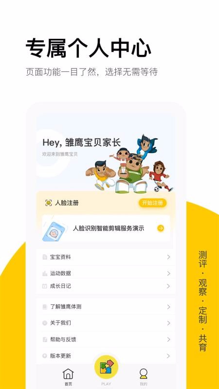 4、划分了丰富的个人中心管理列表分组,其中有宝宝资料、运动数据以及了解雏鹰体测等管理栏;