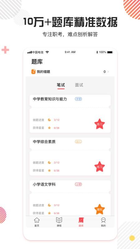 教师资格证题库app是专为备考教师资格证的用户提供的一款手机学习软件,这里为用户提供了大量的题库资源,收录了大量的历年考试真题,拥有各种题型,用户可以自由的在这里选择适合自己的题型进行手机刷题,让你可以得到更好的学习效果;不仅如此,这里还为用户提供了大量的视频教学,更有各种优质的直播课程,你可以在这里通过观看直播的方式与更多的学员进行互动交流学习,从而学习更多的知识内容,并且还可以在这里下载你的学习视频,方便你没有网的情况下也可以离线观看学习,非常的方便。