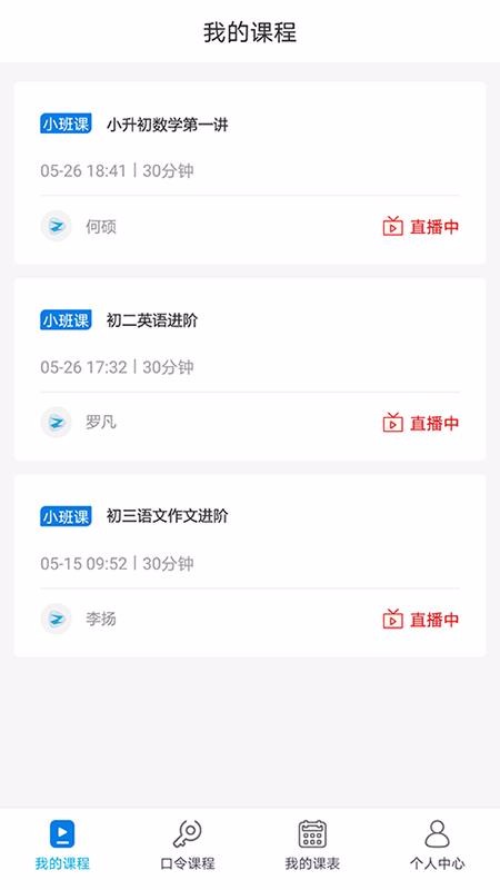1、显示实时在课程状态,我的课程列表中罗列了自己所有课程并展示实时状态提醒;