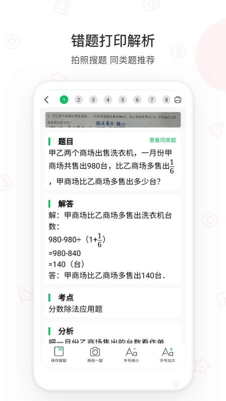 6、拍照搜索题目,将学习的资料拍照,查看该题目详细的答案以及同类题推荐;