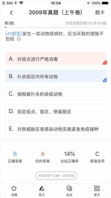 2、拥有丰富题目解析内容展示,其中包括正确答案、你的答案、正确率以及易错题选项等内容;