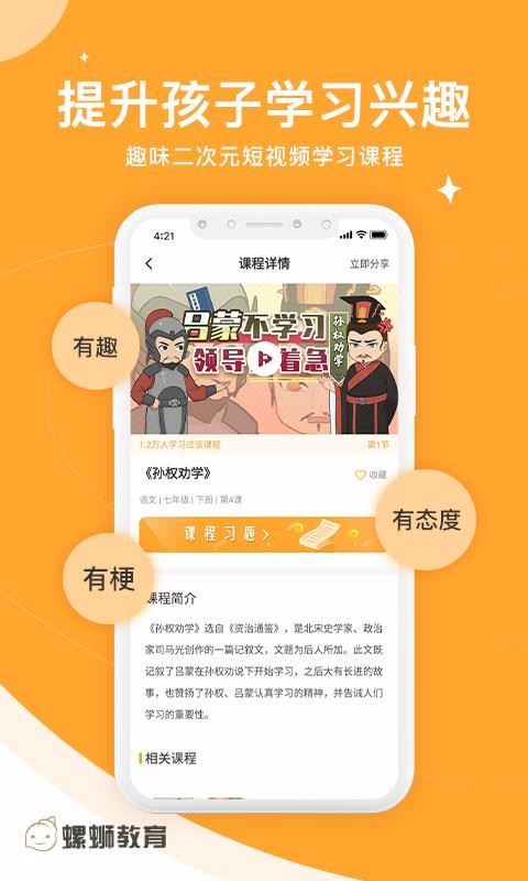 螺蛳教育是一款趣味学习教育软件,以短视频的方式呈现了各种教育课程知识内容,更加采用了有趣的各种教学画面展示教学情境;里面提供了与中学生教材应用同步的资源,可以从平台上找到同步的语文、历史以及地理等不同的教材电子课程内容,学习的时候就能将这些电子课程内容打开在线阅读学习;另外还根据教材内容提供了同步的课程视频资源,严格按照教材中相应的教学目录与大纲录制了有序的课程视频资源;除了课内的同步学习资源外,还提供了课外甄选的相关拓展知识专区,学生不仅能从课本内容中学习基础知识,还可以拓展更多的课外知识内容。