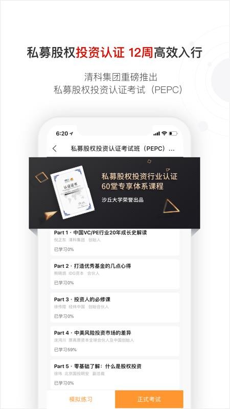 6、为用户提供私募股权投资认证考试内容,用户可以快速进行模拟练习和正式考试;