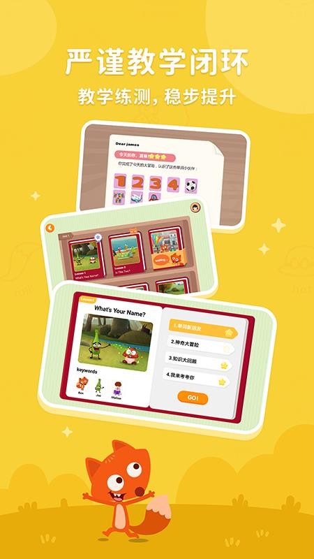 小狐狸英语是一款可以帮助孩子快速学习英语的软件,平台里具有标准的英语发音系统,可以让孩子更好的锻炼口语能力,帮助孩子更好的进行使用,实时的提高孩子的英语能力,在线就能够更好的进行学习,非常的方便;平台里提供的英语知识非常的丰富,海量的学习资源全部展示在平台里,孩子在学习的时候可以随意的进行选择,更好的解决你的使用需求;同时,平台会智能的检测孩子的英语水平,为孩子制定优质的学习方案,通过平台的学习,全面的提升孩子的英语水平,而且孩子在平台里可以实时的进行互动,更好的增加孩子的学习兴趣,高效的学习英语知识。
