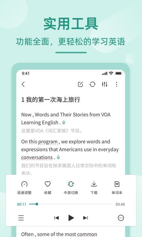 5、提供齐全的学习工具,包括语速调节、收藏、下载、中英切换等等;
