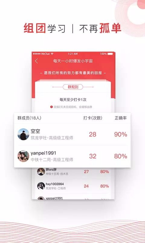 2、用户选择组团学习更加的方便,方便用户查看到群成员的做题状态;