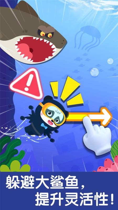 4、通过海底潜水躲避大鲨鱼提升灵活性,进入深海潜水游戏中并动手拖动方向躲避大鲨鱼;