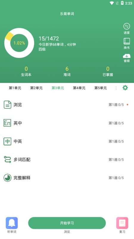 5、返回主页点击听单词,可以收听每一个单元的单词音频信息