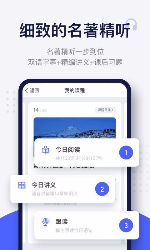 1、我的课程中拥有多种课程辅助学习环节,其中包括今日阅读、今日讲义以及跟读练习等;