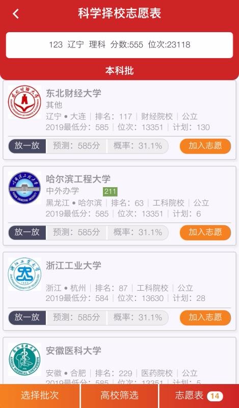 5、根据用户预测的分数推荐了填报的院校,还显示了被录取的概率,让用户了解录取情况;