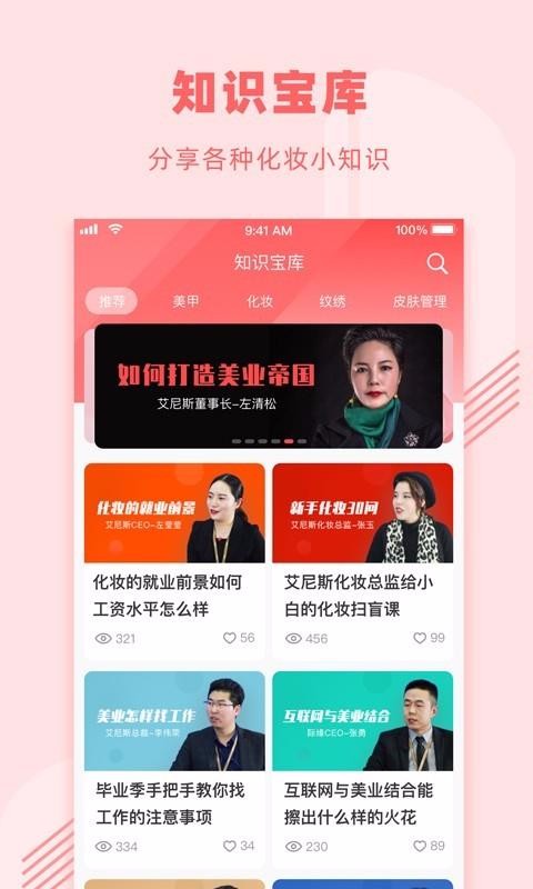 5、点击知识宝库,选择推荐、美甲、化妆等分类