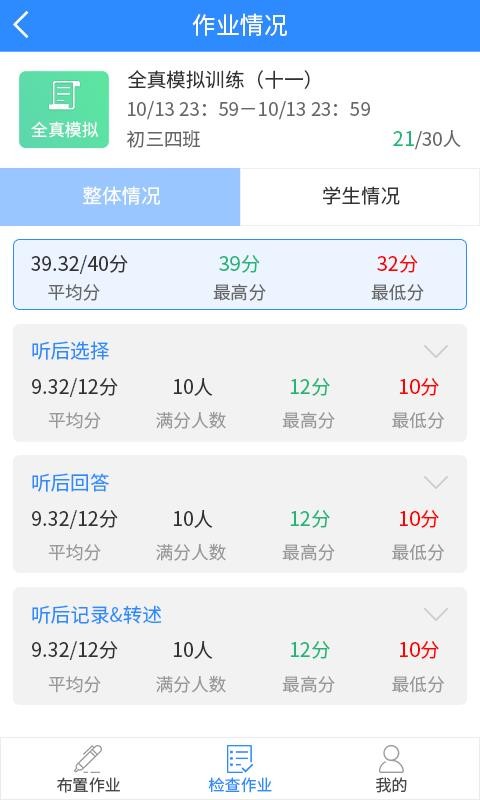 慧听说教师端app是一款为初三英语老师打造的教学辅导软件,英语老师可以在软件轻松的对学生教学进行管理,老师可以在线直接布置作业、检查作业,根据自己所教的班级随时切换查看学生作业完成的情况,对老师的教学减轻的很多的压力,也有效的提高了教学的质量;软件上有完成的英语作业练习题目,包含全真模拟、靠前冲刺、专项训练、同步练习,老师可以根据教学的进度对学生进行相应的作业布置,让学生及时的巩固练习,加强学生的英语学习,顺利的完成中考,取得满意的成绩;感兴趣的老师可以下载试一试。
