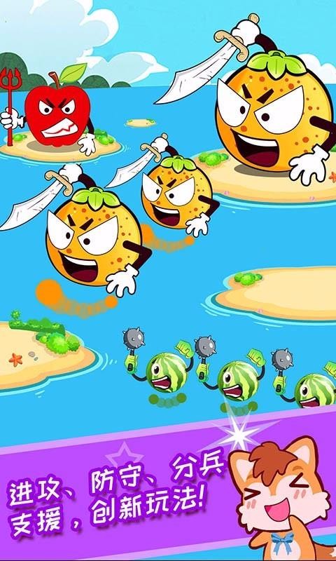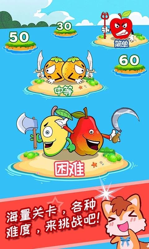儿童水果大作战是一款水果作战游戏,该游戏的场景设置到一个水面上,水面上还有不同的小岛,不同的小岛中有不同的水果模板,根据不同的难度展示了相应的难度通关提示;宝宝们在玩游戏的时候需要拓宽自己的岛屿领地,因为最开始的时候自己只有一个小岛,所以需要向其他的岛屿进攻来获取更多的岛屿领地;当自己在仅供其他岛屿的时候有可能会被其他的水果攻击自己的据点,这个时候就需要宝宝们从自己其他据点中调取水果小兵们来守卫自己的家园;随着自己岛屿据点范围越来越大,自己需要攻克的岛屿难度也越来越大,带给宝宝们一定的挑战性。
