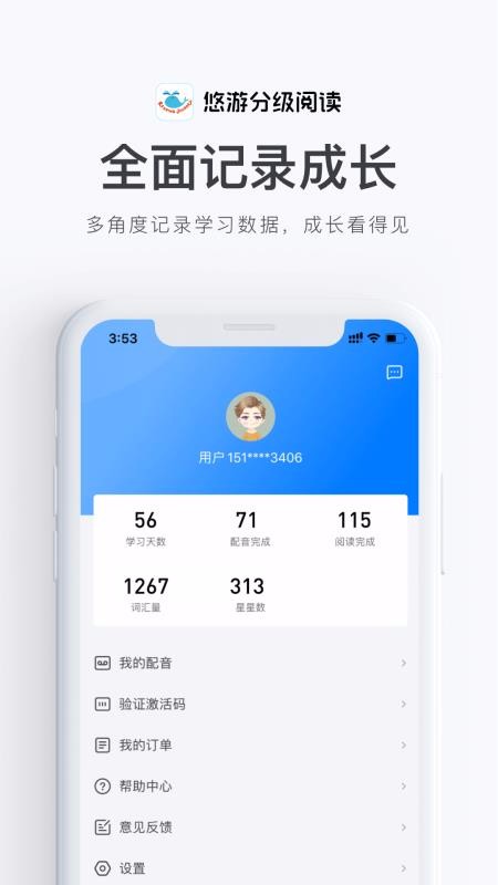 4、全面记录了学习成长数据,记录学习天数、配音完成数量、阅读完成数量以及词汇量等数据;