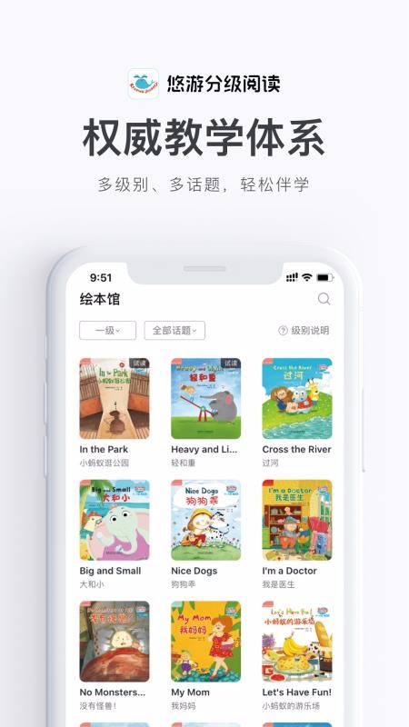 6、拥有多级别、多话题的海量绘本资源,这些资源按照难度等级、不同的话题进行了自动划分归类;