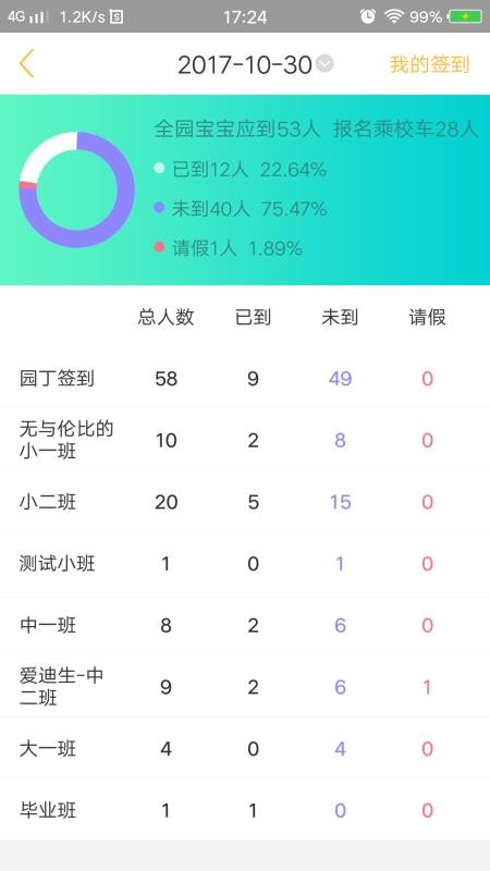 5、通过软件用户可以看到校园中各个班级的签到情况,了解每个孩子的进园状态;