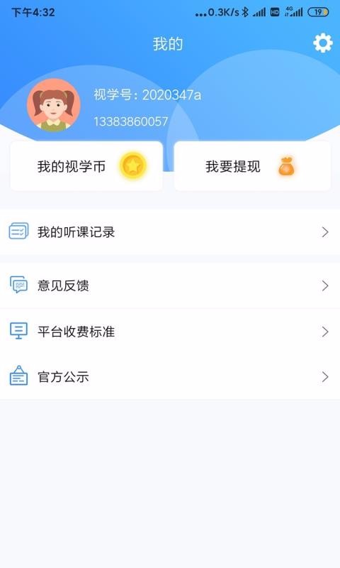 2、点击我的,查看我的听课记录、意见反馈、官方公示等
