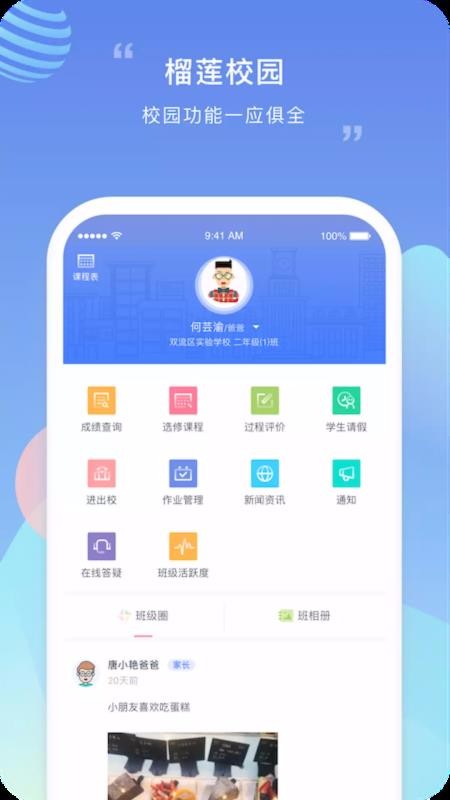 榴莲校园app是沟通家庭与学校的桥梁,应用的使用对象是有孩子在上学的家长,根据校园相关管理需求设计了丰富的功能应用,比如成绩查询、选修课程、作业管理以及进出校管理等;为每一个孩子都打造了专属的班级圈,家长会根据自己绑定的孩子情况自动进入到相应的班级圈中,看到孩子所在班级的最新动态信息;另外在班级圈旁边设置了班相册栏,所有发布或上传过的照片全部汇集到该栏,能在这里翻看孩子们的照片;家长们可以通过选修课程中心推送的课程资源为自己的孩子选课,可以根据孩子的兴趣爱好,也可以根据自己想要培养的方向选择课程。