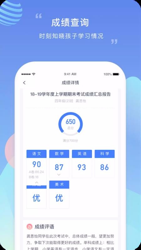 5、丰富的成绩详情内容,不仅能看到每一个科目分数,还能看到老师的成绩评语;