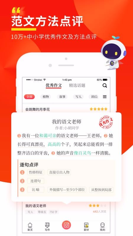 2、优秀作文:提供众多的优秀作文点评,可以根据分类进行查看点评的内容;