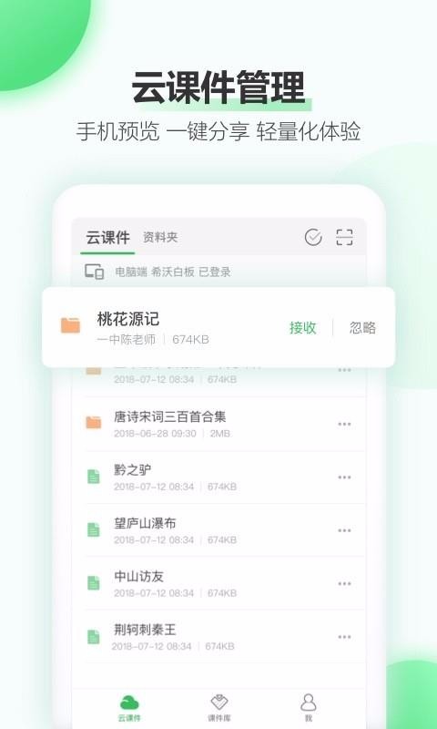 希沃白板是专门为老师打造的教学软件,老师可以使用该软件连接电脑进行移动授课,同时可以在该软件中管理课件,课件也可以在手机端和电脑端实现互传;当该软件与电脑连接后,可以使用手机控制电脑来播放课件,实现与学生的互动,支持的功能有批注、相机、传屏和摄像;该软件也拥有丰富的课件资源,选择年级、科目、单元内容后,就会为你推荐该单元的所有课件,你可以自行选择合适的进行下载使用;而教师也可以在该平台中查看自己的影响力,并且还有当地影响力的排行榜,可以查看自己的排名和排名附近的老师名单。